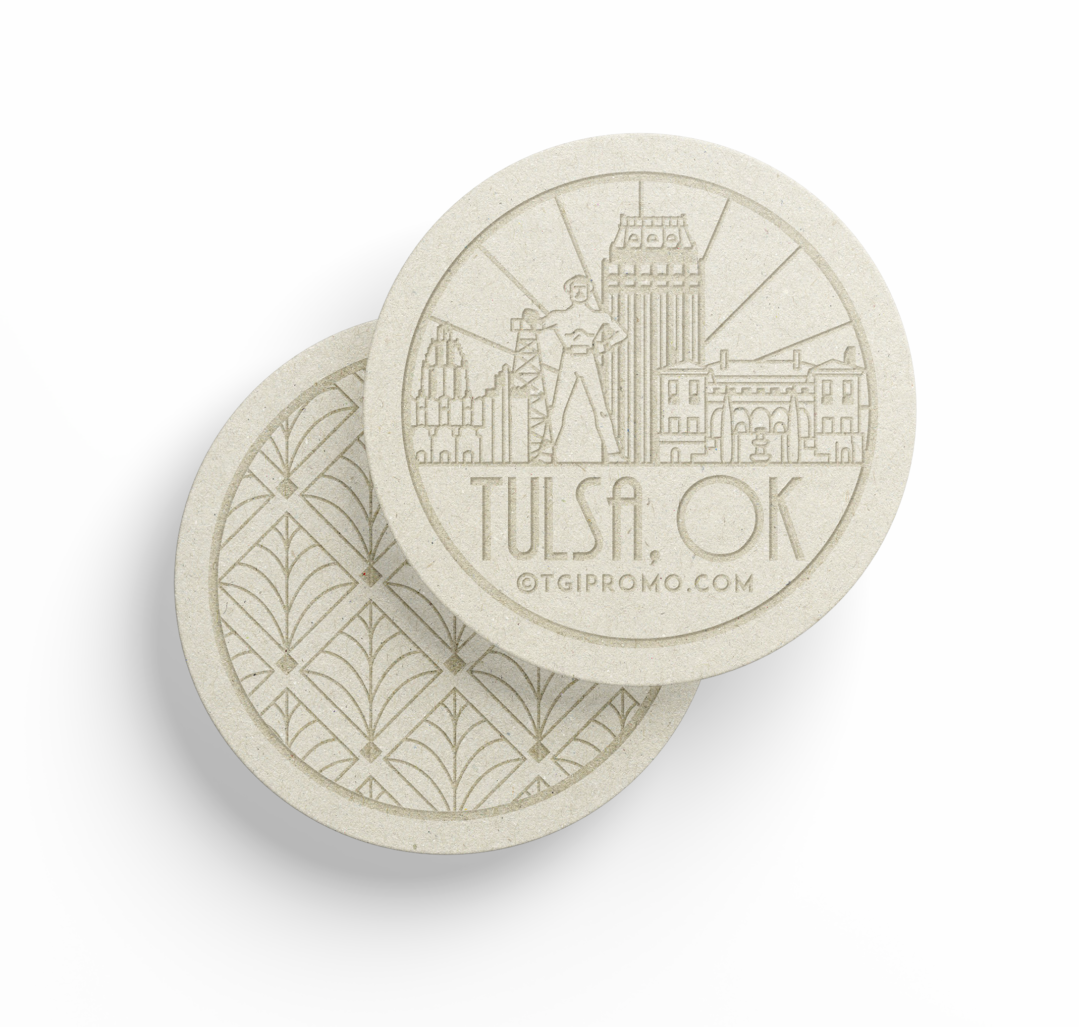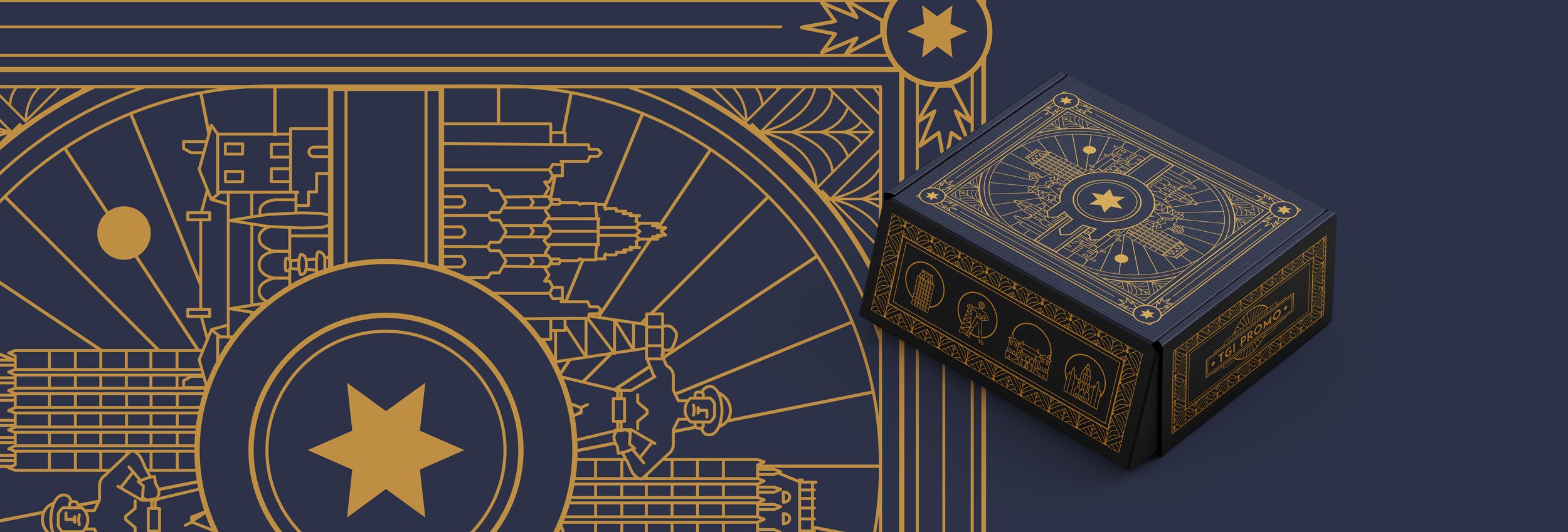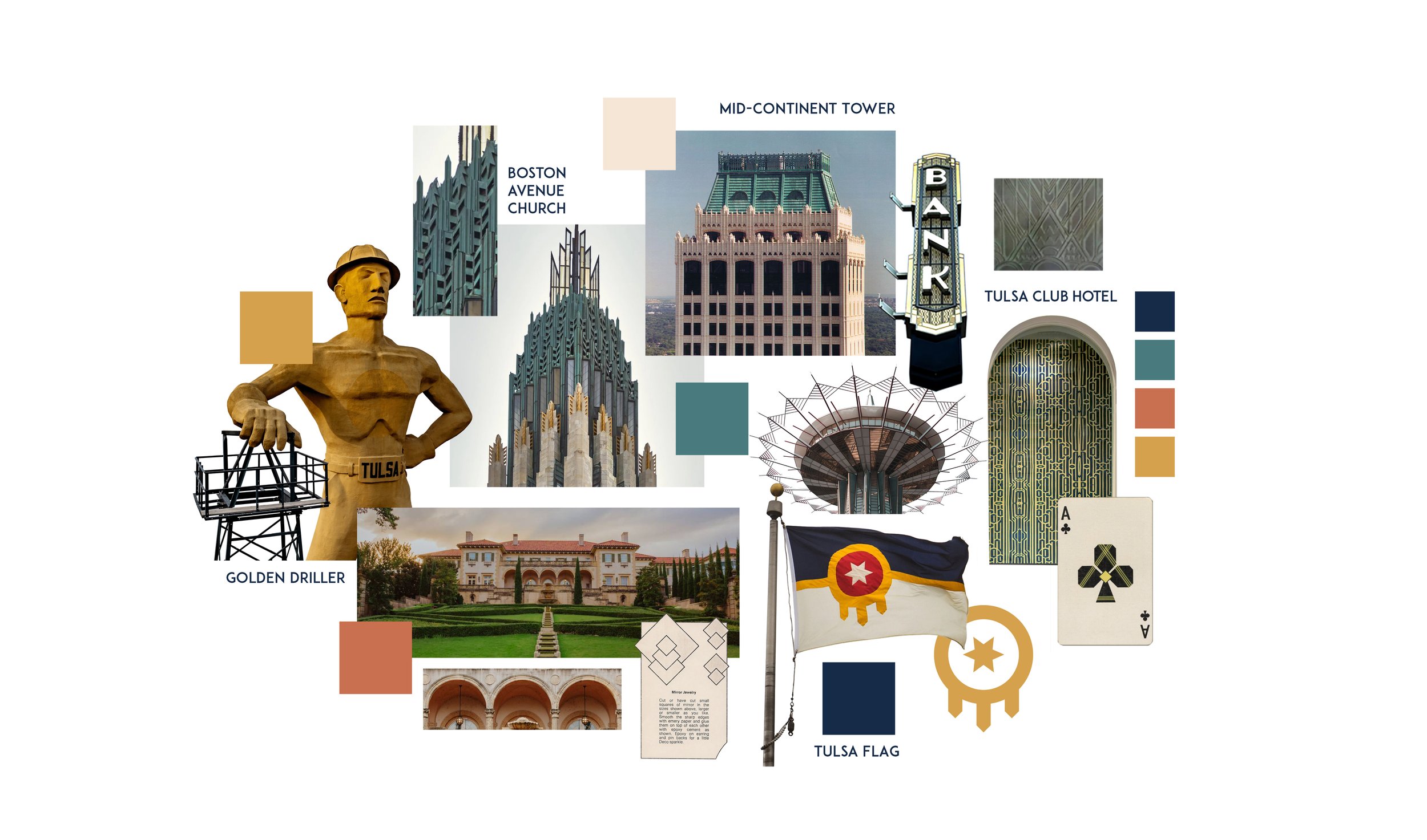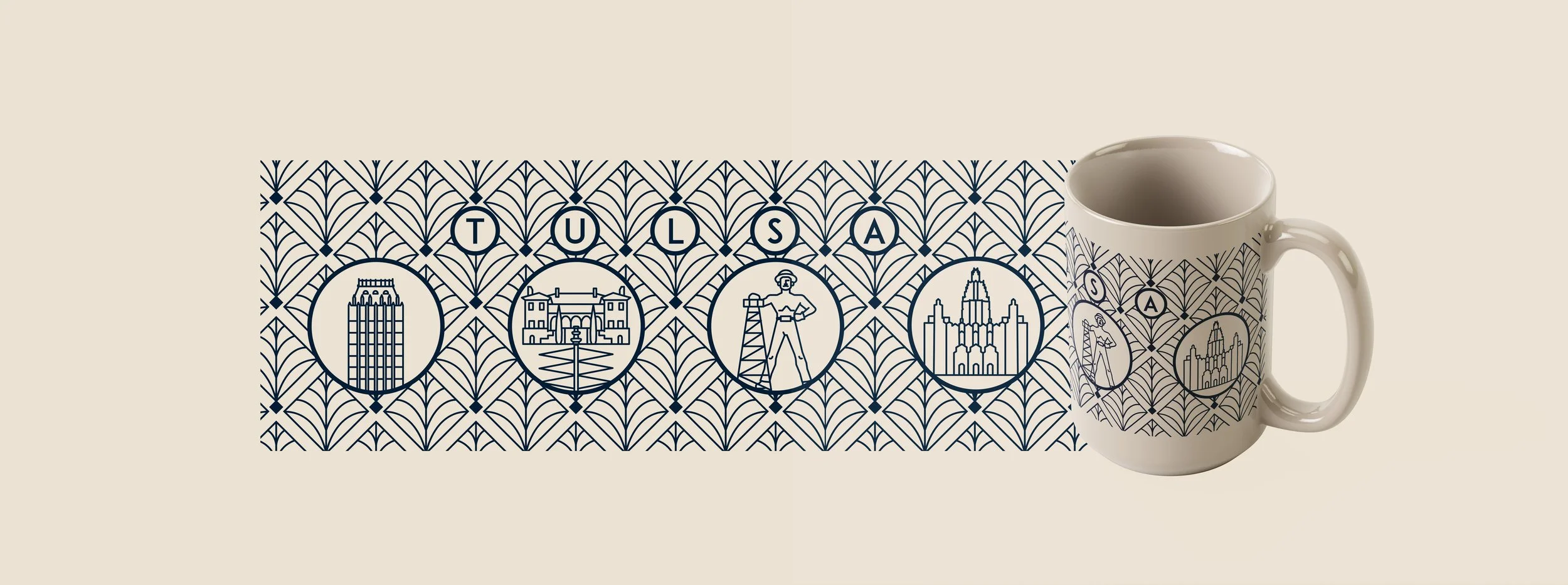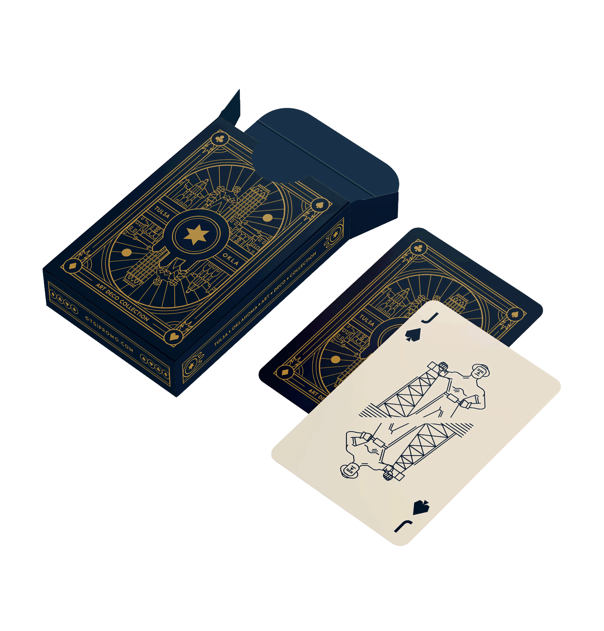While working at TGI Enterprises, Inc., stakeholders desired to represent Tulsa’s unique art deco architecture history through a merchandise showcase and approached me to art direct, design, and lead in-house designers for their quick-paced project. Deliverables include: merchandise box, deck of playing cards, mug, coaster, luggage tag, and leather padfolio.