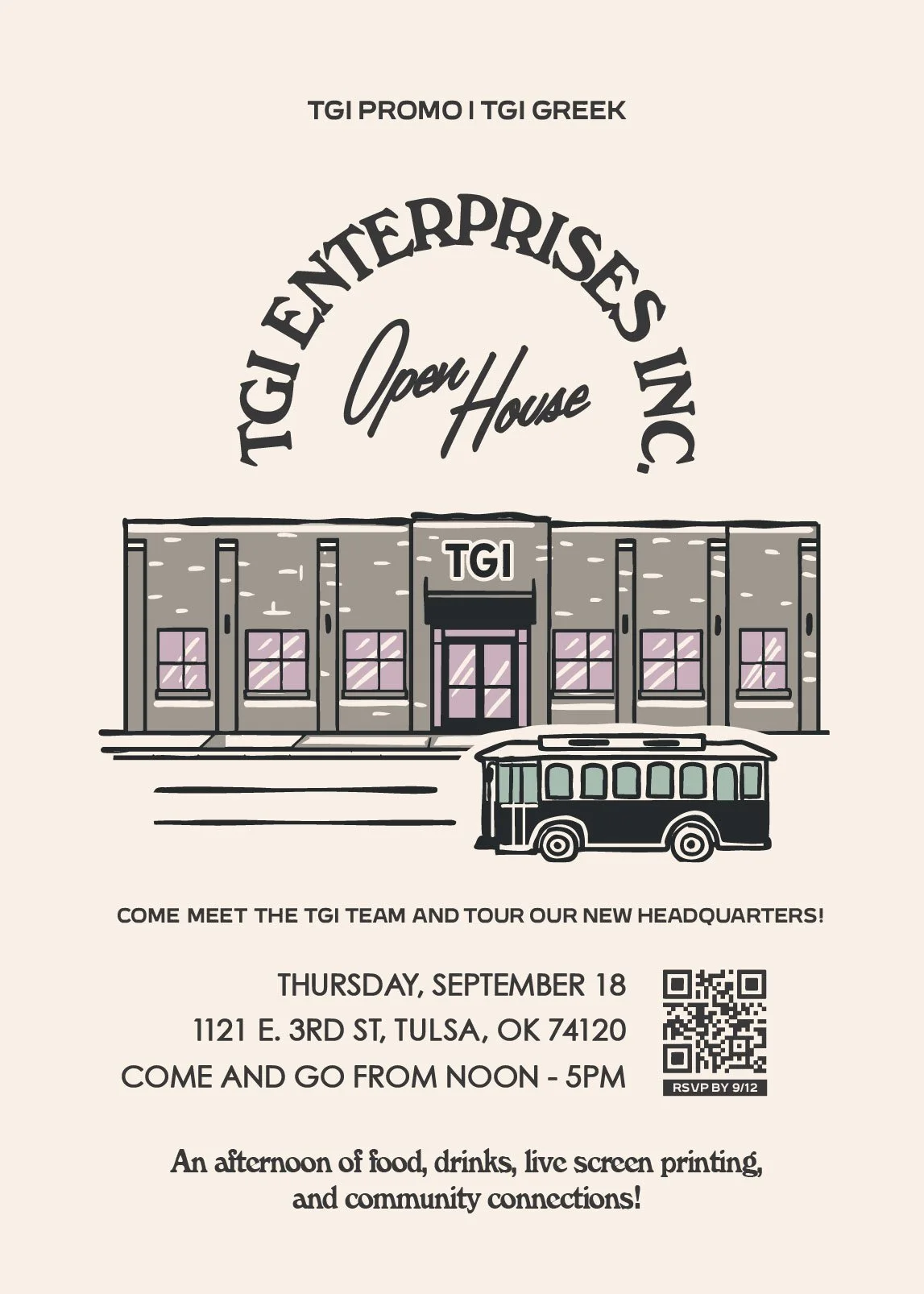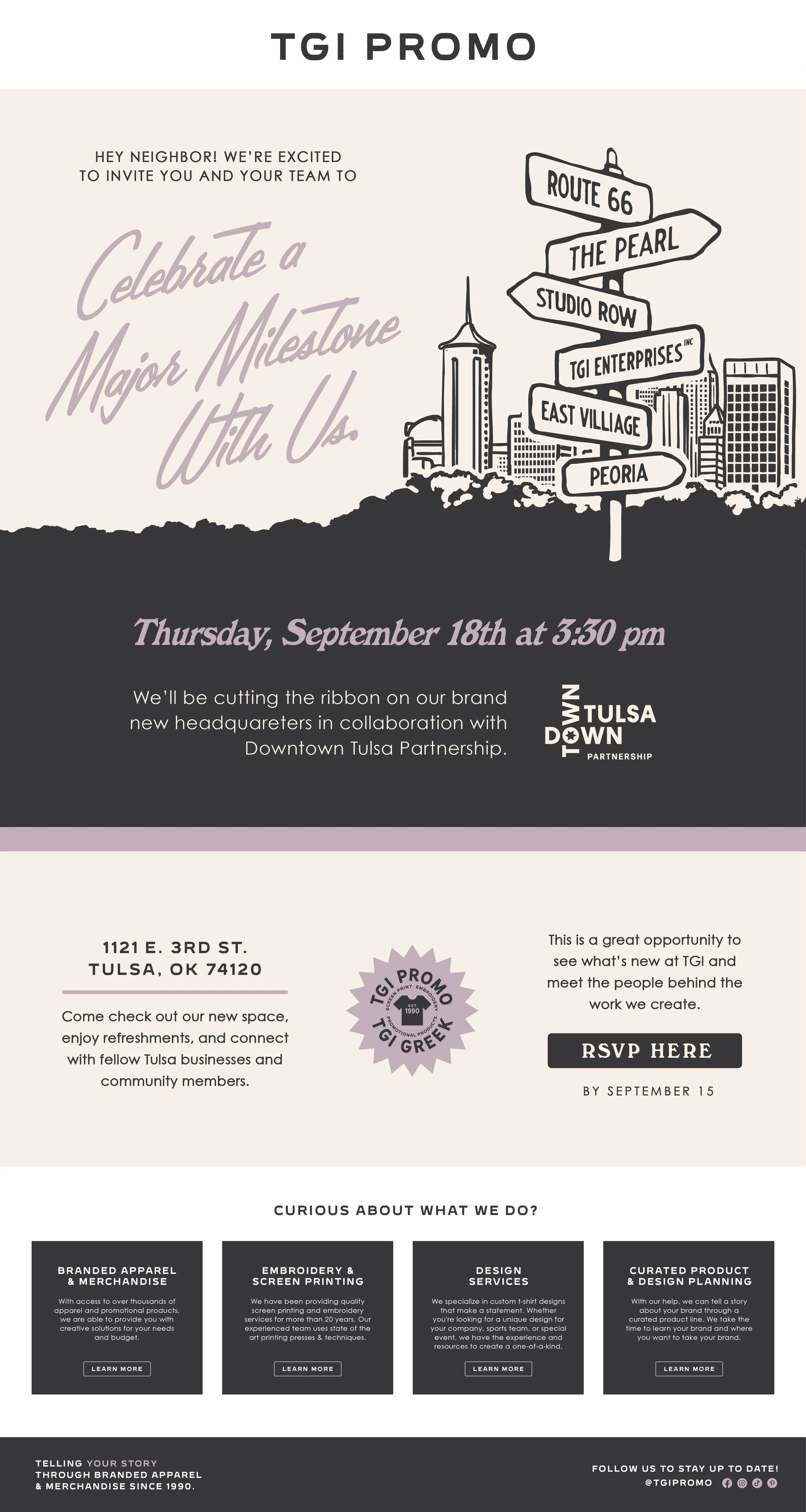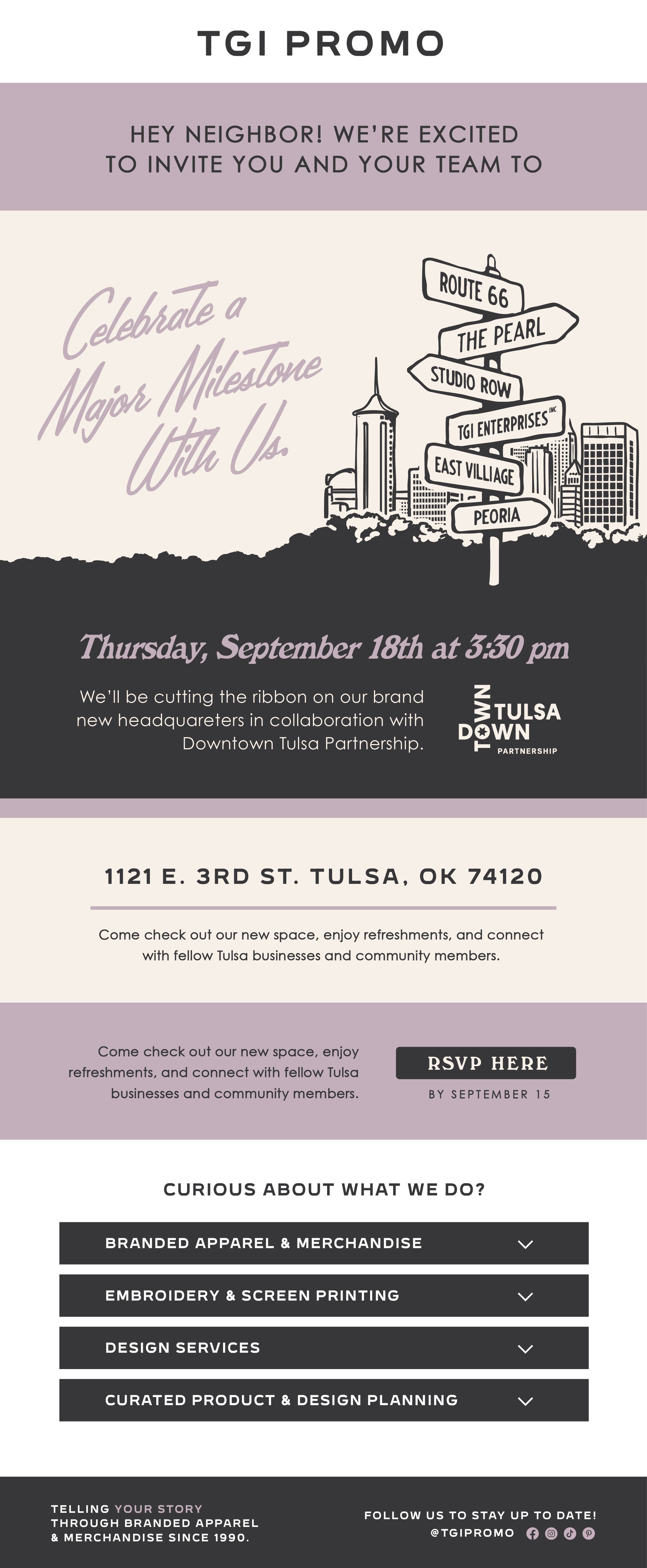 While working under TGI Enterprises, Inc. as their Director of Brand and Visual Strategy, I was tasked with art directing the company’s open house campaign celebrating their move into Tulsa’s Pearl District. The project’s goals were to announce TGI’s move into their newly restored building, promote an open house of the space, highlight neighboring establishments, and use the move as an opportunity to introduce TGI to The Pearl District.